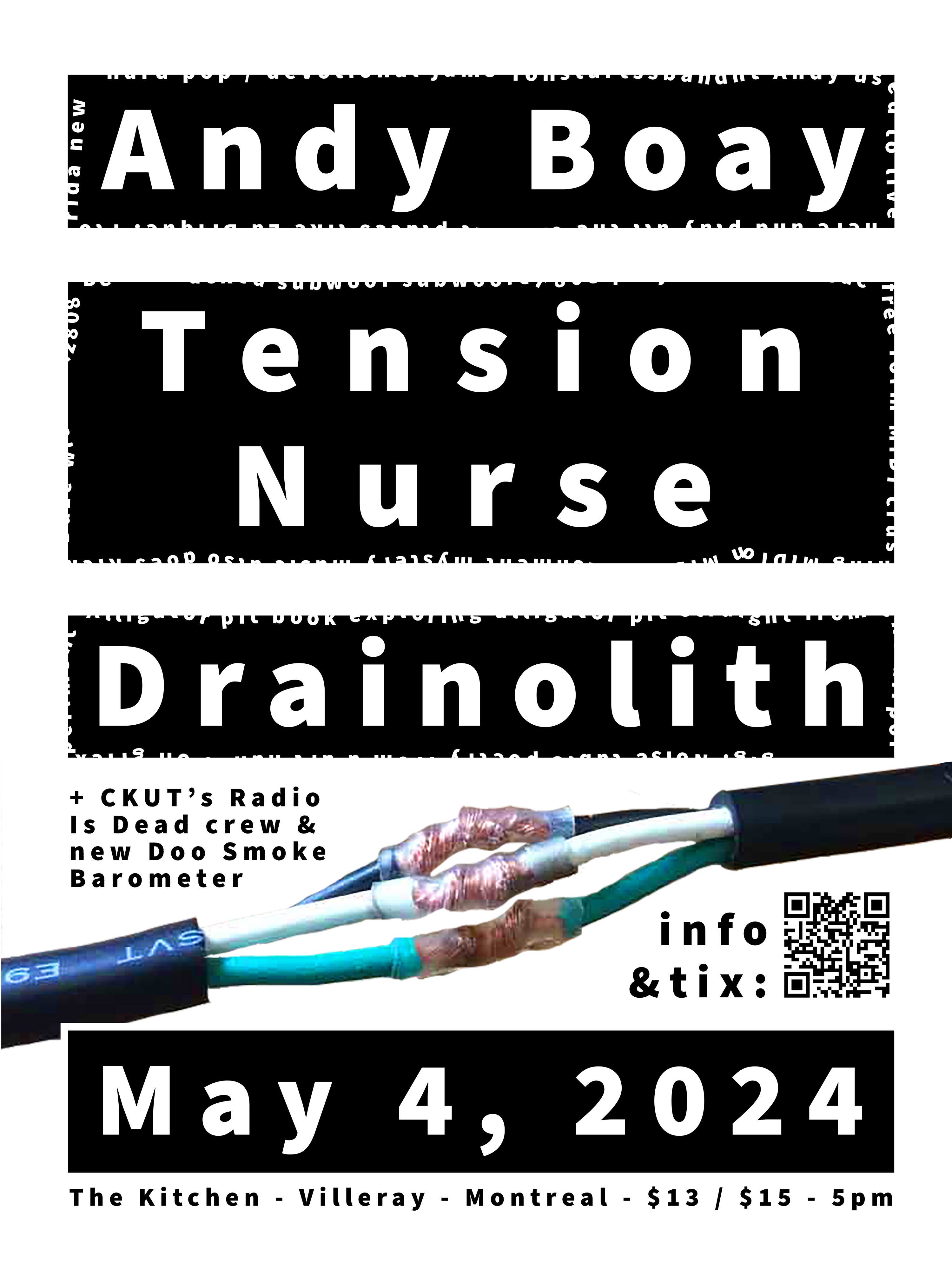 On Saturday May 4th in Montreal we're going to be hosting an evening gig with live music from Andy Boay, Tension Nurse, Drainolith, and CKUT's Radio Is Dead crew.